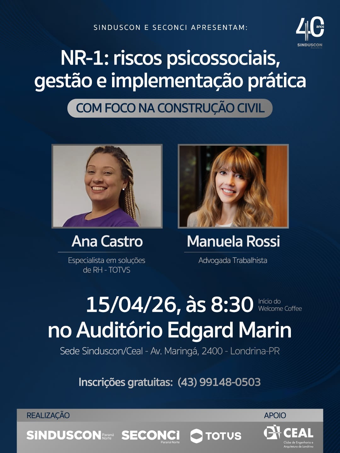Local: Auditório Edgard Marin (Sede do Sinduscon/Ceal) – Av. Maringá, 2400 – Londrina